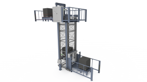 In tire industry mixing rooms, master batch rubber compounds often need to be transported again to the higher-level mixer. Or, in some cases, all loaded pallets of rubber must be moved to a higher floor. All the classic solutions, such as using a hugger belt and a second stacking unit on the mixer floor or a freight elevator to transport the pallets, have proved to be either too complicated or too cumbersome and laborious. A suitable industrial solution isn’t available either. Therefore, VMI now offers a pallet transporter that is just as robust and reliable as the renowned, heavy-duty VMI pallet conveyors. An important design requirement was that the transporter and the linked conveyor system must be able to transport a 1,700 kg pallet to the mixer level in less than a minute. This means that this transporter can “simultaneously” process pallets from multiple mixing lines.