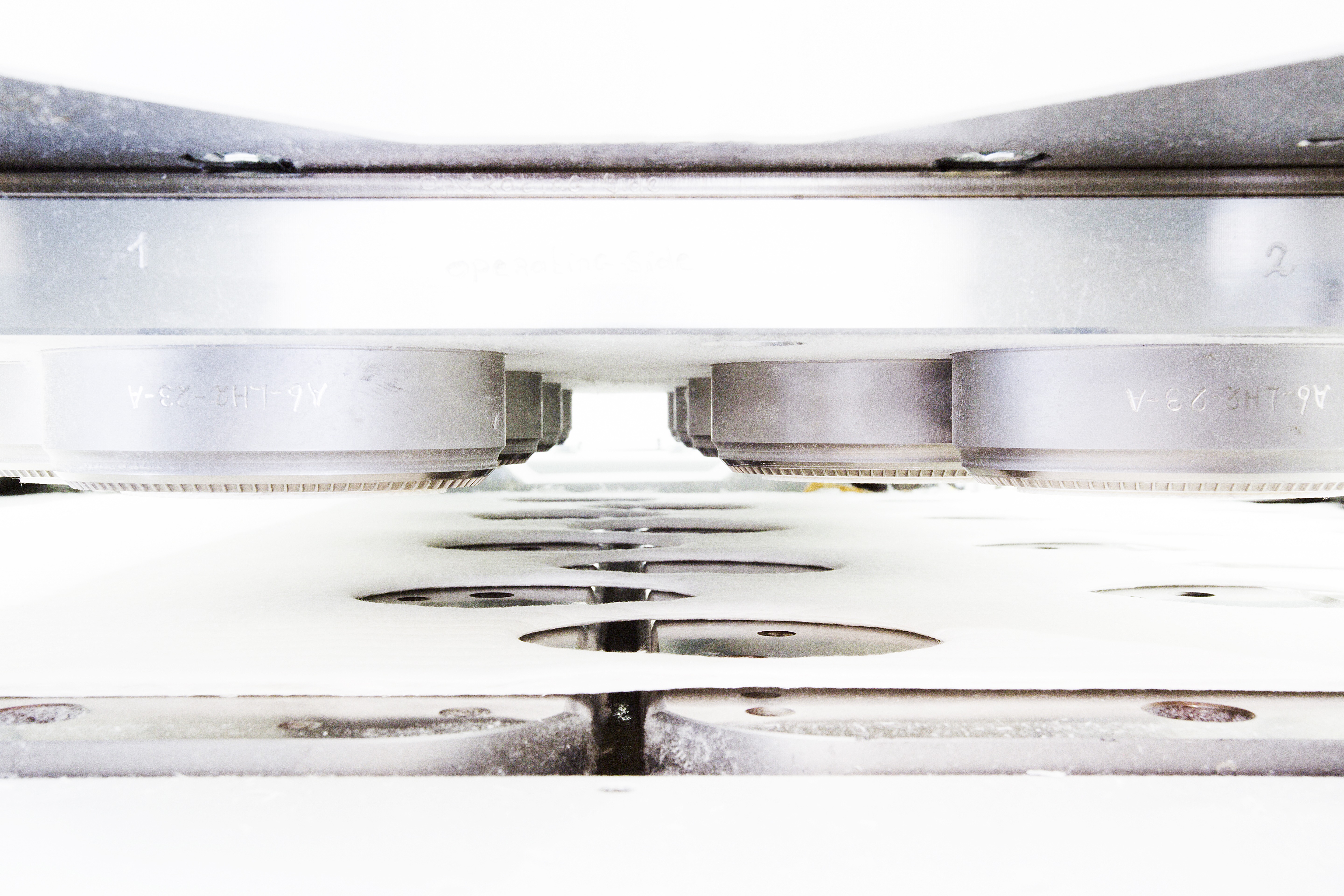 The cotton web is automatically inserted in the ACE cotton pad production machine with the unwinder unit. The punch unit with dies, punches the pads out the cotton web in nice stacks into a product carrier. A swift change-over to a large variety of pad shapes by switching product related parts ensures a highly flexible production level. Every format punching tooling such round, oval or square is available in a stitch and non-stitch version.